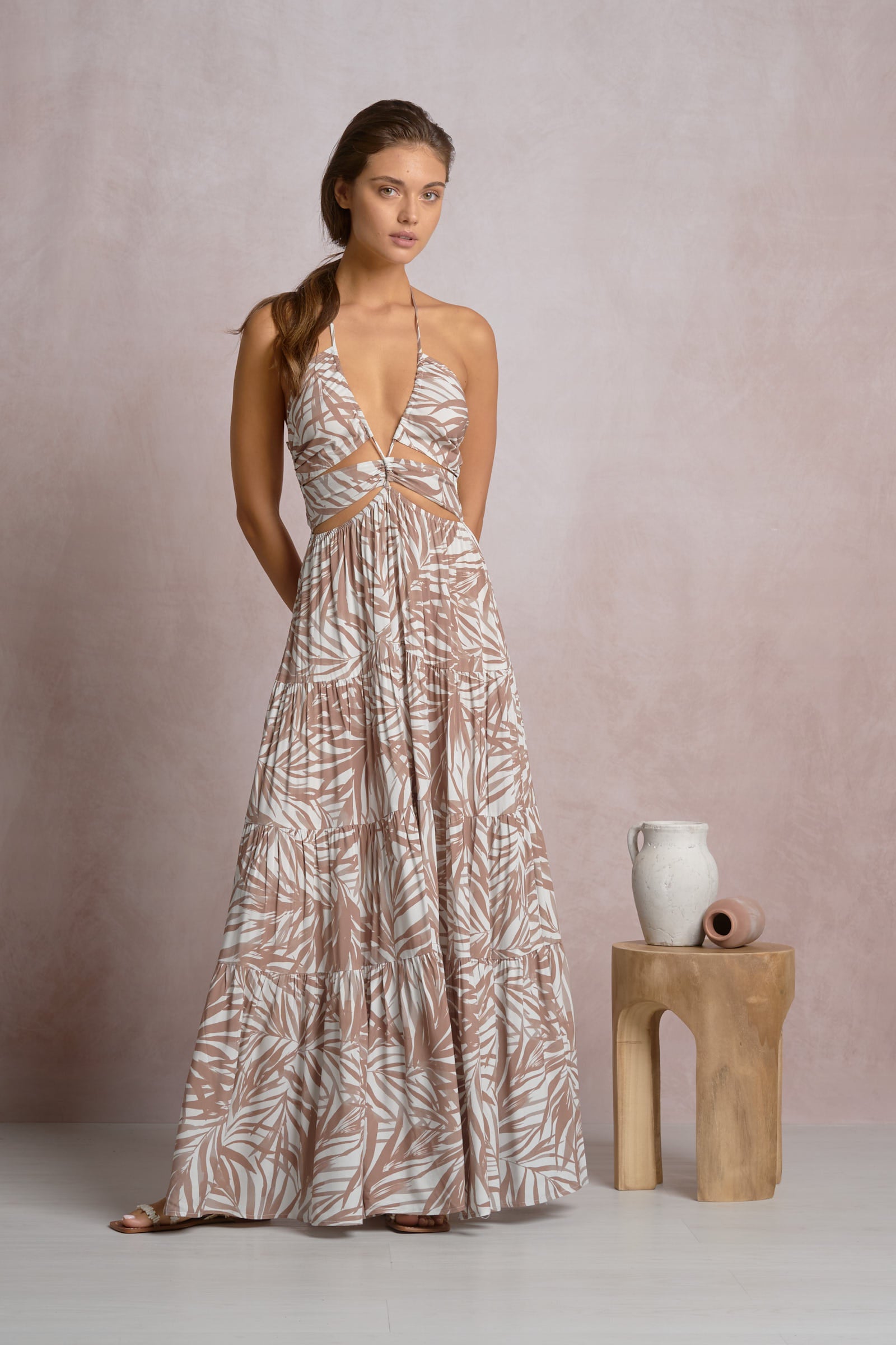 Embrace tropical elegance with this striking maxi dress, featuring an allover palm print that captures the essence of island sophistication. Strategic cutout details add modern flair while maintaining refined coverage, creating visual interest without compromising comfort. Adjustable straps ensure a personalized fit for all body types, allowing you to customize the silhouette to suit your preferences. The flowing maxi length provides effortless movement, making it equally suited for resort wear, evening events, or elevated casual occasions. A versatile piece that transitions seamlessly from day to night.