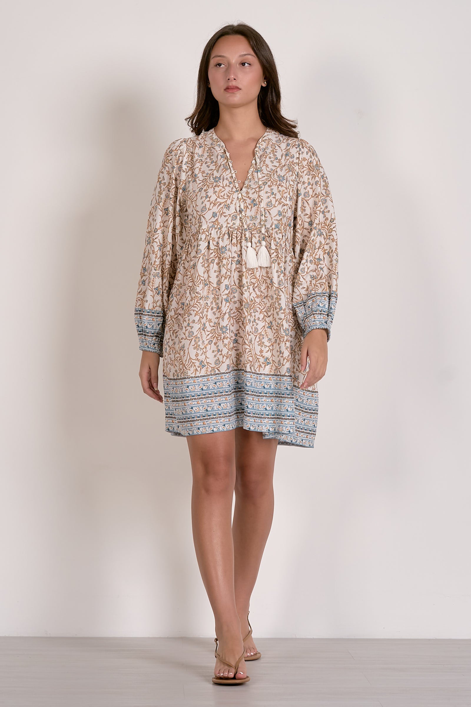 Crafted with meticulous attention to detail, this baby doll dress combines a timeless silhouette with contemporary design elements. The long sleeves offer versatile layering, while the V-neck creates a flattering silhouette, enhanced by adjustable strings for a customized fit. Delicate border detailing adds visual interest and sophistication to this wardrobe essential. Perfect for transitional seasons, this piece transitions effortlessly from casual outings to more polished occasions, offering both comfort and style for the discerning wearer.