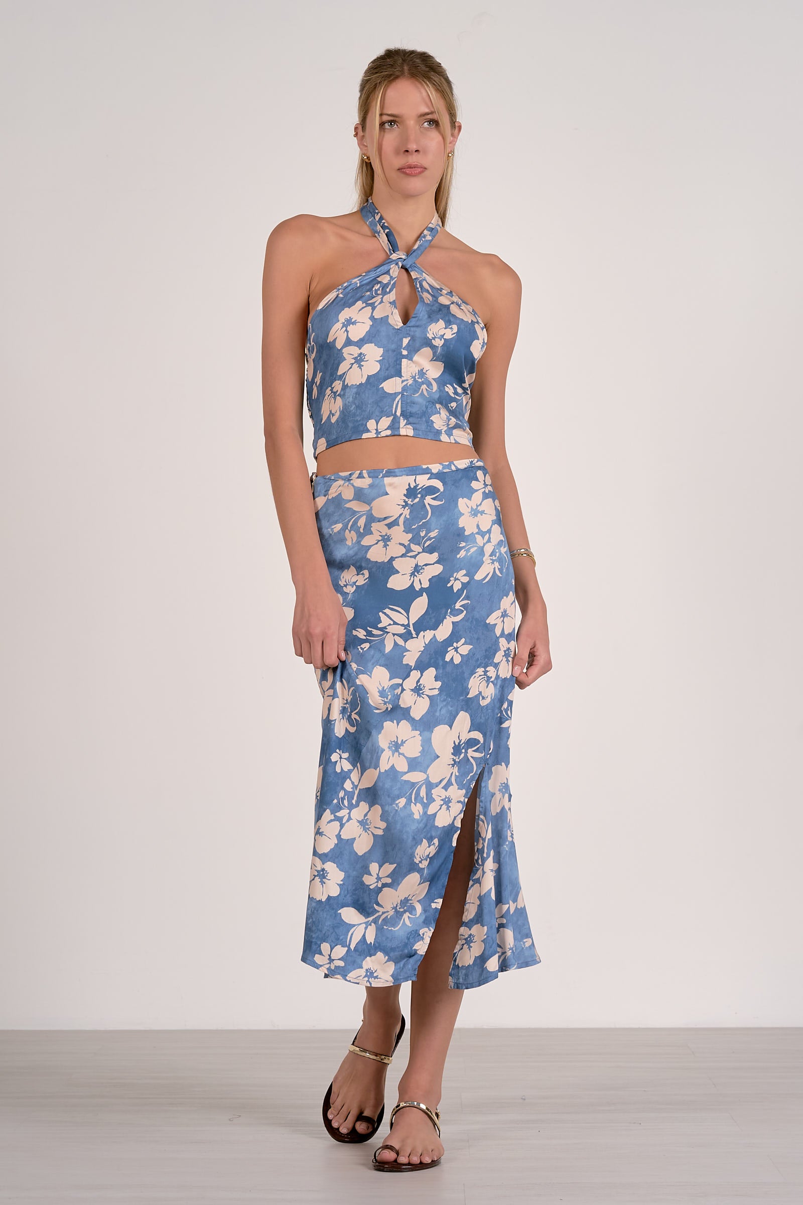 Elevate your warm-weather wardrobe with this sophisticated twisted halter crop top, featuring an enchanting Blue Blossoms print that captures effortless elegance. Crafted from luxuriously silky smooth fabric, it drapes beautifully against the skin while maintaining its shape throughout the day. The distinctive twisted halter neckline creates a flattering silhouette that works seamlessly with high-waisted bottoms. Pair it with the coordinating Capri Midi Skirt for a polished, cohesive look that transitions seamlessly from day to evening.