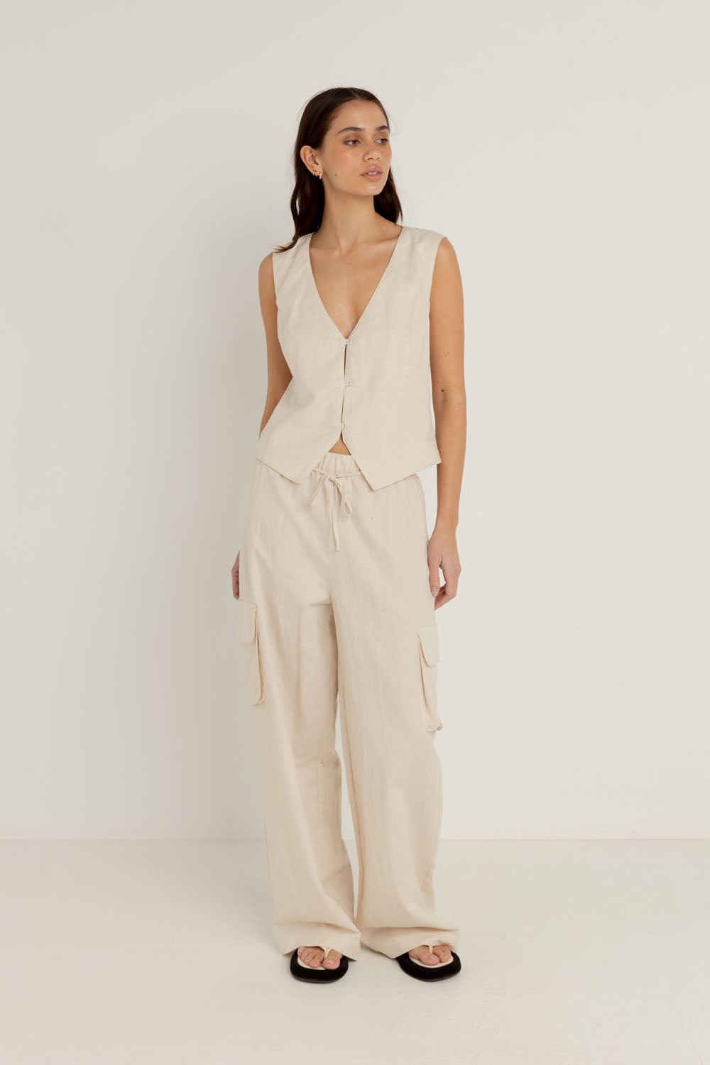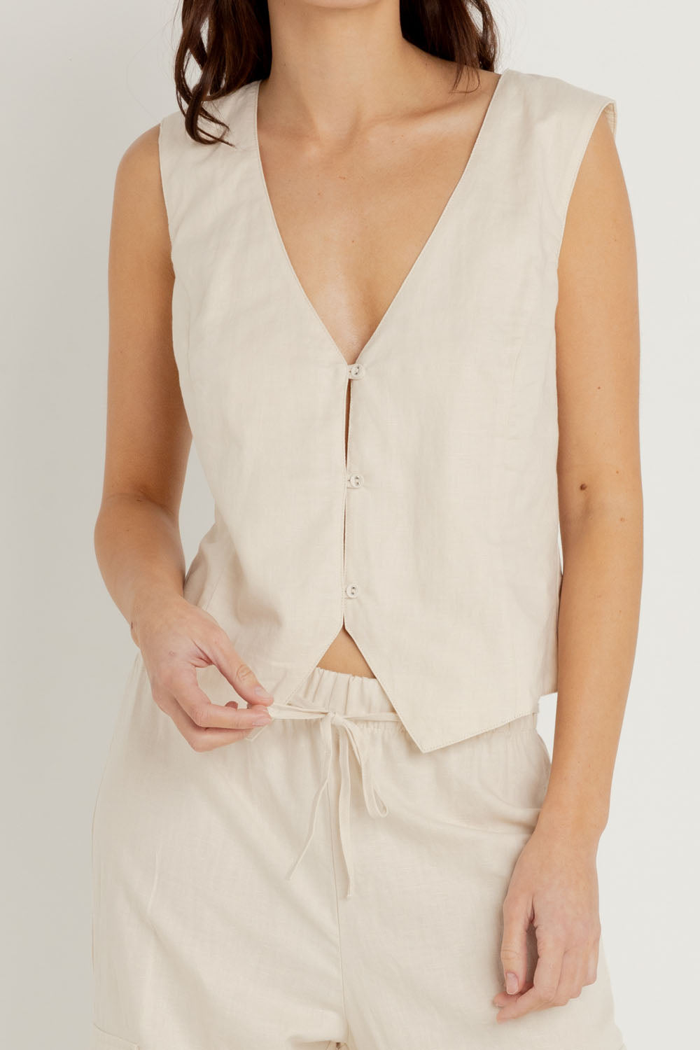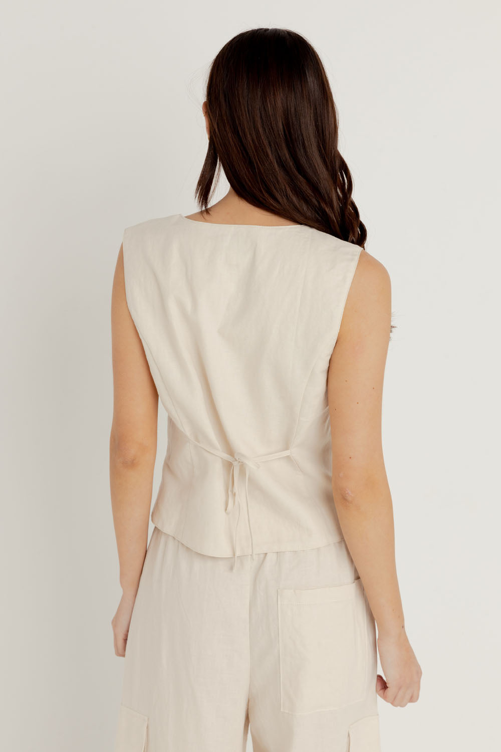 Linen-blend tailored vest with princess seams, spaghetti tie at the back, and a soft hand feel.