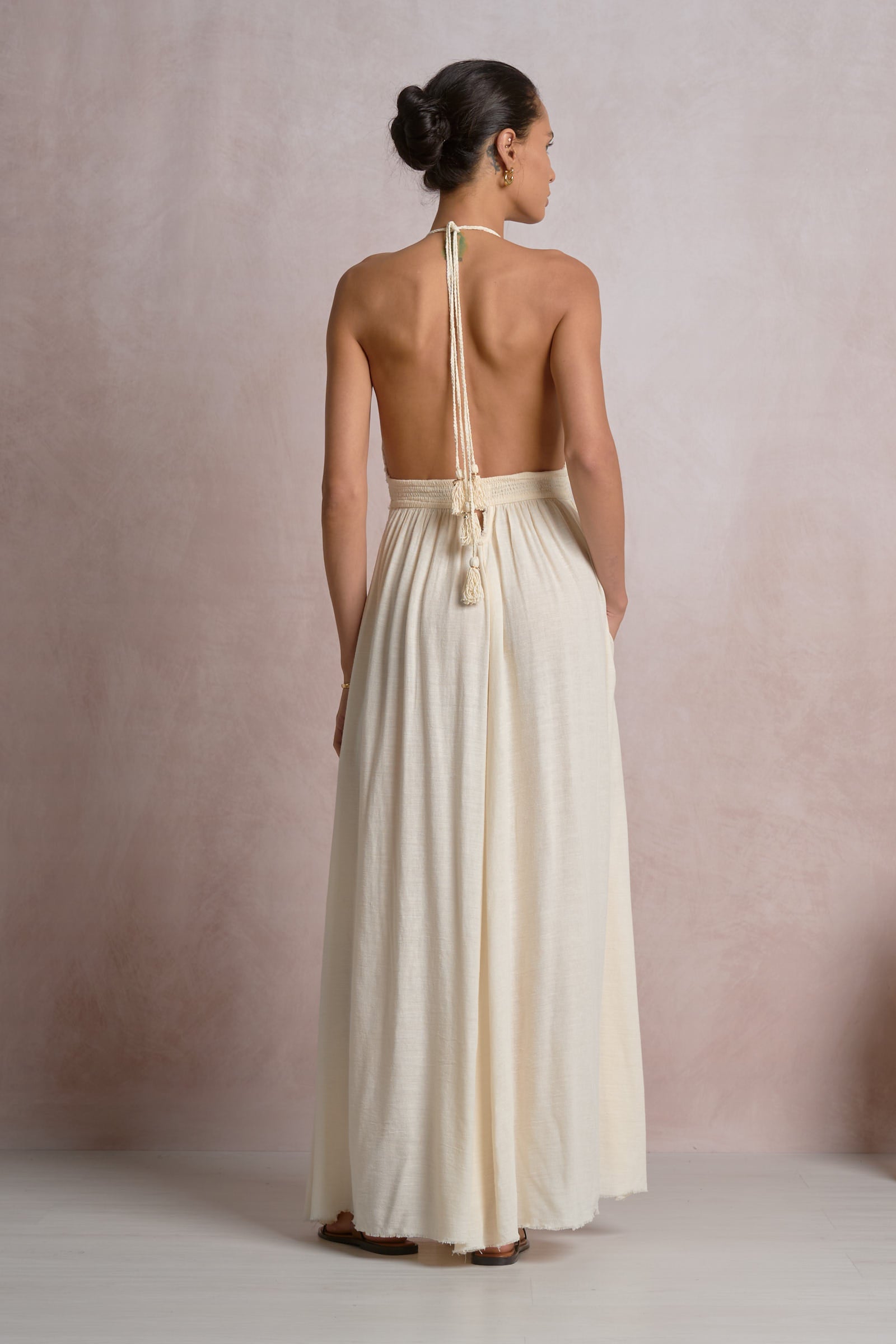 Elevate your evening wardrobe with this sophisticated halter maxi dress in off-white. Designed with a flattering deep V neckline and open back, the adjustable tie halter provides both elegance and support. The smocked waistband creates a refined silhouette while the center slit adds movement and allure. Perfect for formal events, this versatile piece combines timeless style with modern design details that command attention.