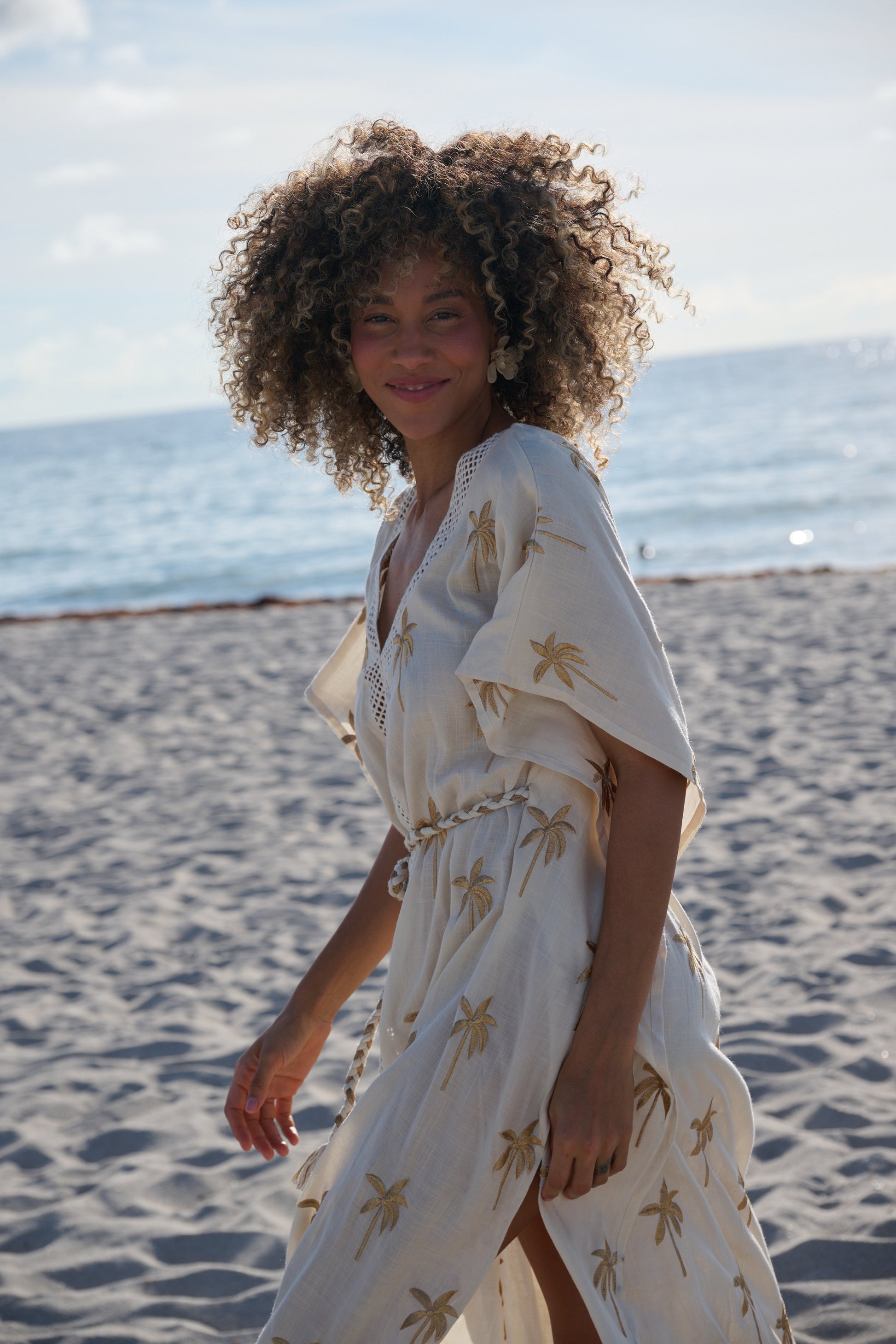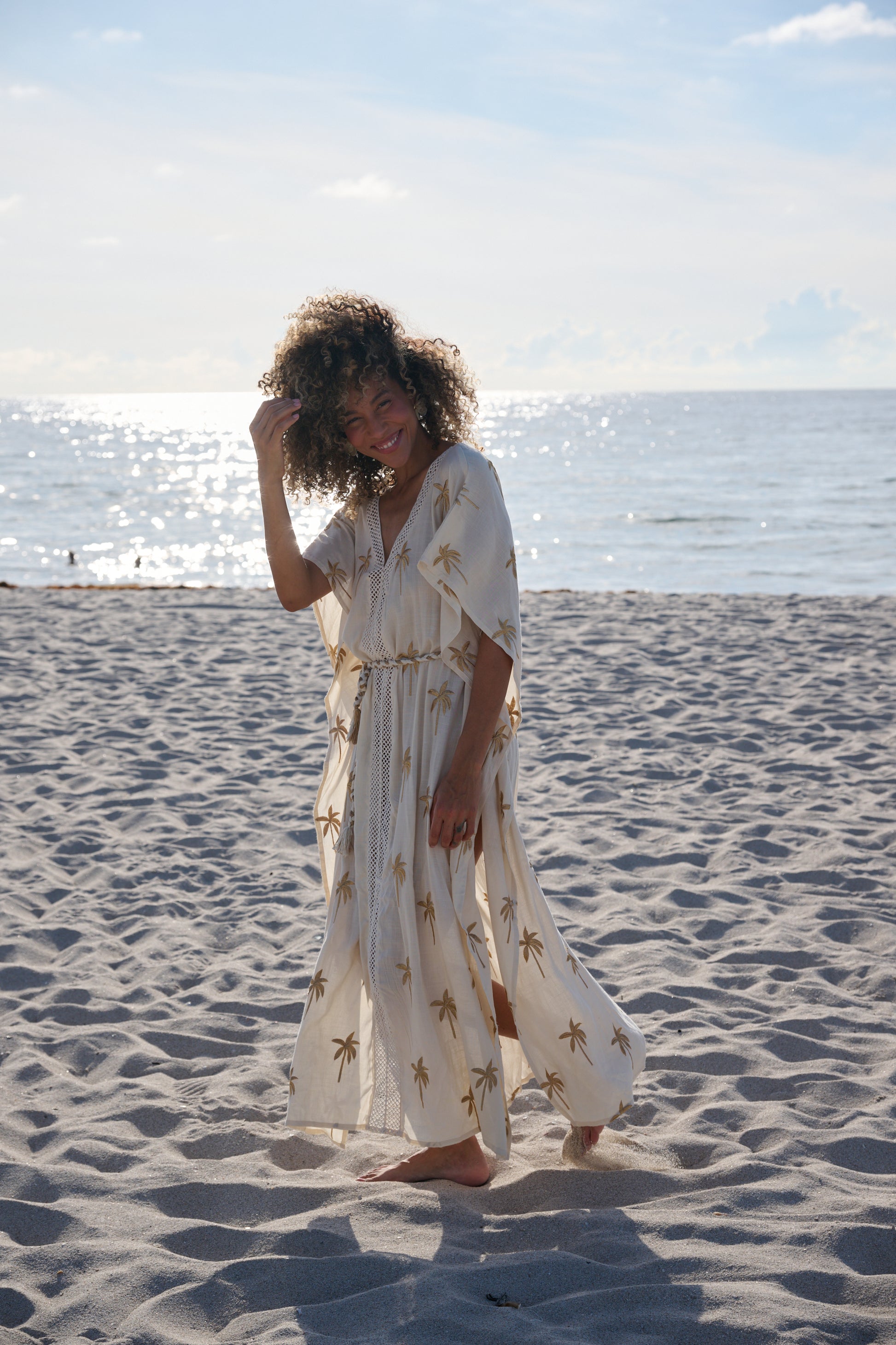 Elevate your beachwear with the Goldie Kaftan, featuring a delicate golden palms pattern that exudes effortless elegance. This lightweight swim cover-up offers breezy comfort, while the intricately braided belt cinches the waist for a flattering silhouette. Perfect for transitioning from poolside lounging to casual strolls, the Goldie Kaftan combines style and function with expert craftsmanship.