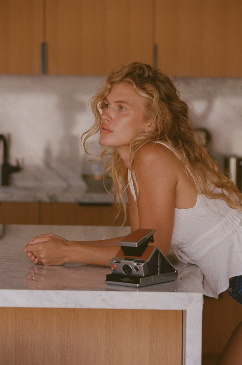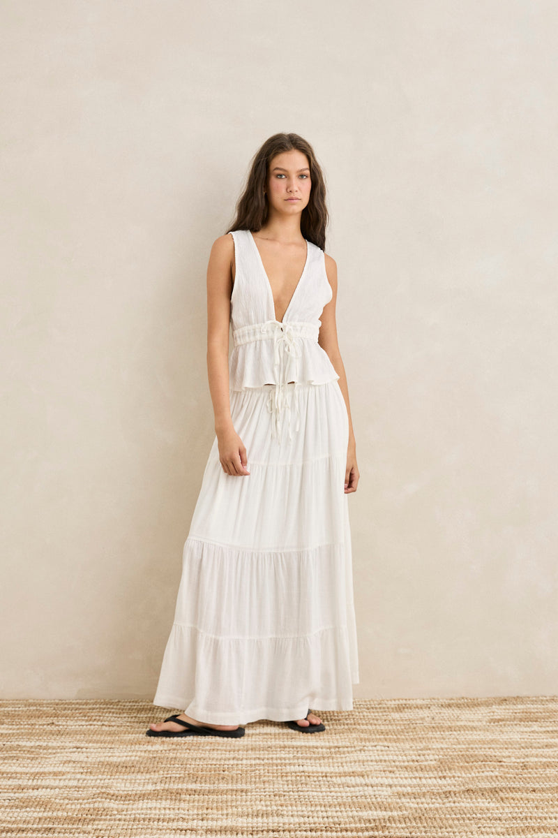 The Keiki Plunge Top in Cream by Rhythm is an elegant addition to any wardrobe, offering both style and comfort. Crafted from organic cotton, this top is not only gentle on the skin but also environmentally friendly. The lightweight crinkled fabric provides a breezy feel, perfect for warm weather.