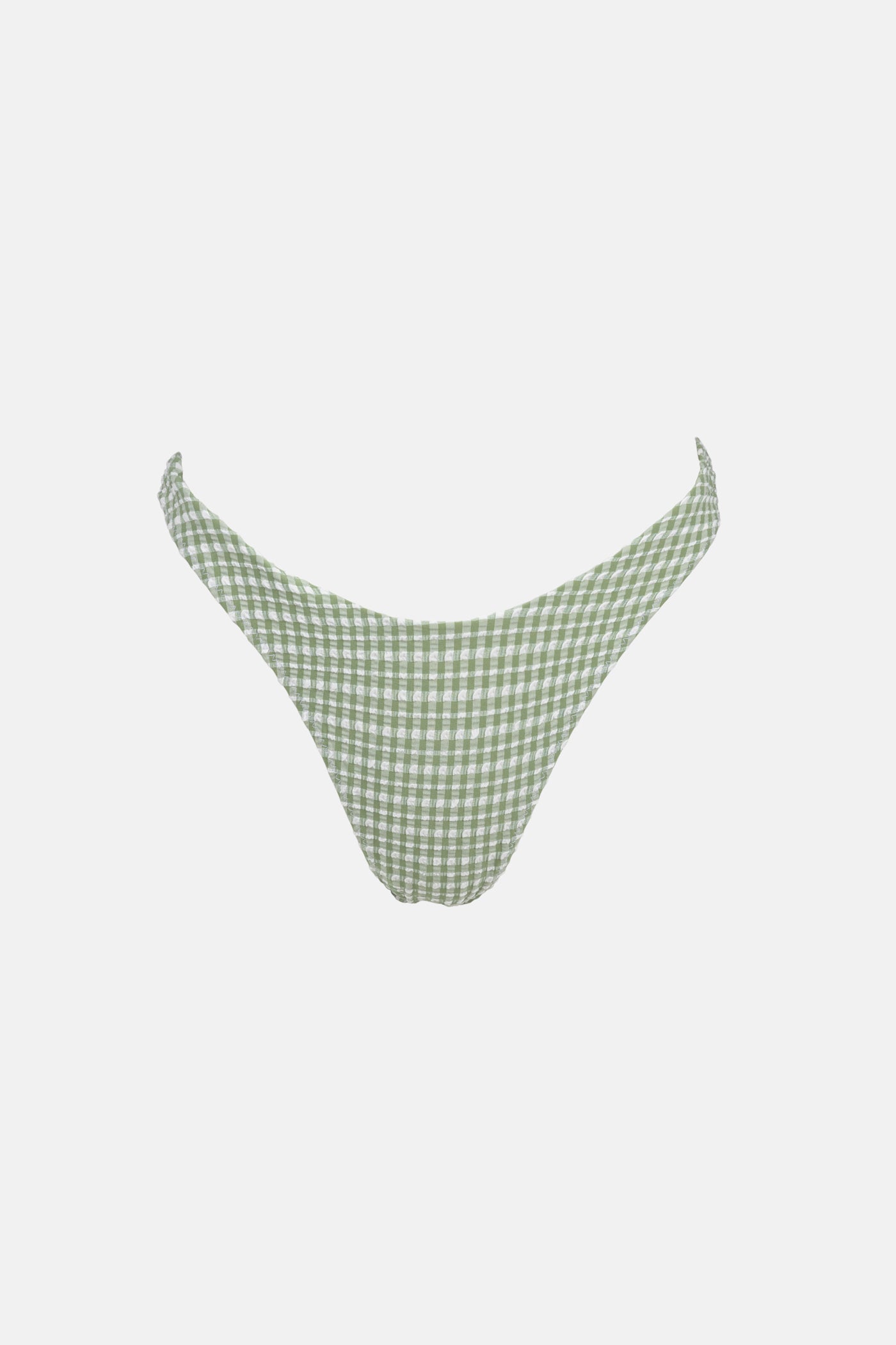 The Lola Check High Cut Bottom features a vibrant green gingham print crafted from textured fabric, offering a distinctive tactile feel. Its high-leg fit enhances the appearance of longer legs, while the cheeky coverage provides a flattering and modern silhouette. Designed for those seeking a stylish yet comfortable swimwear bottom, this piece balances trend-forward design with functional wearability.