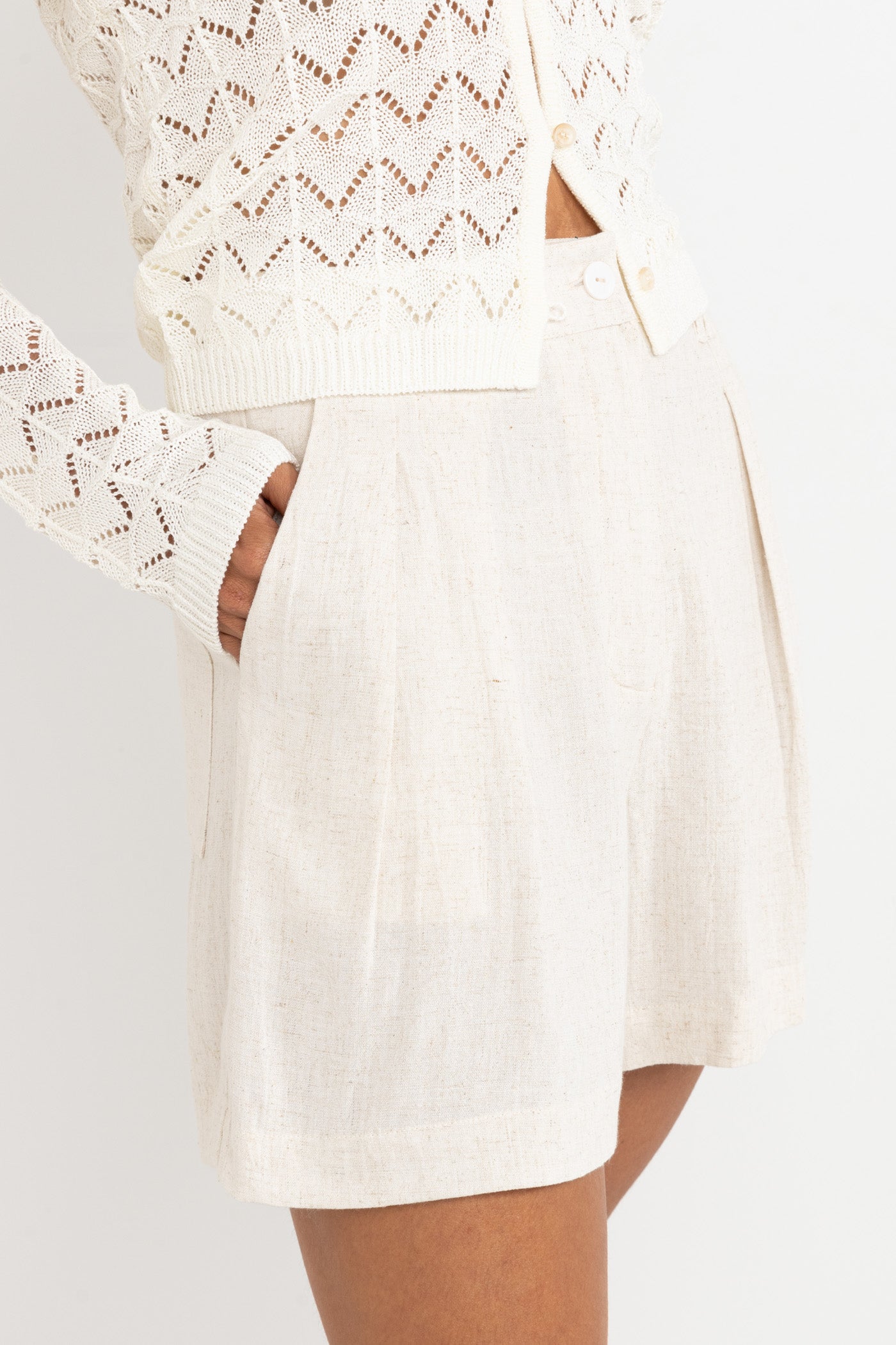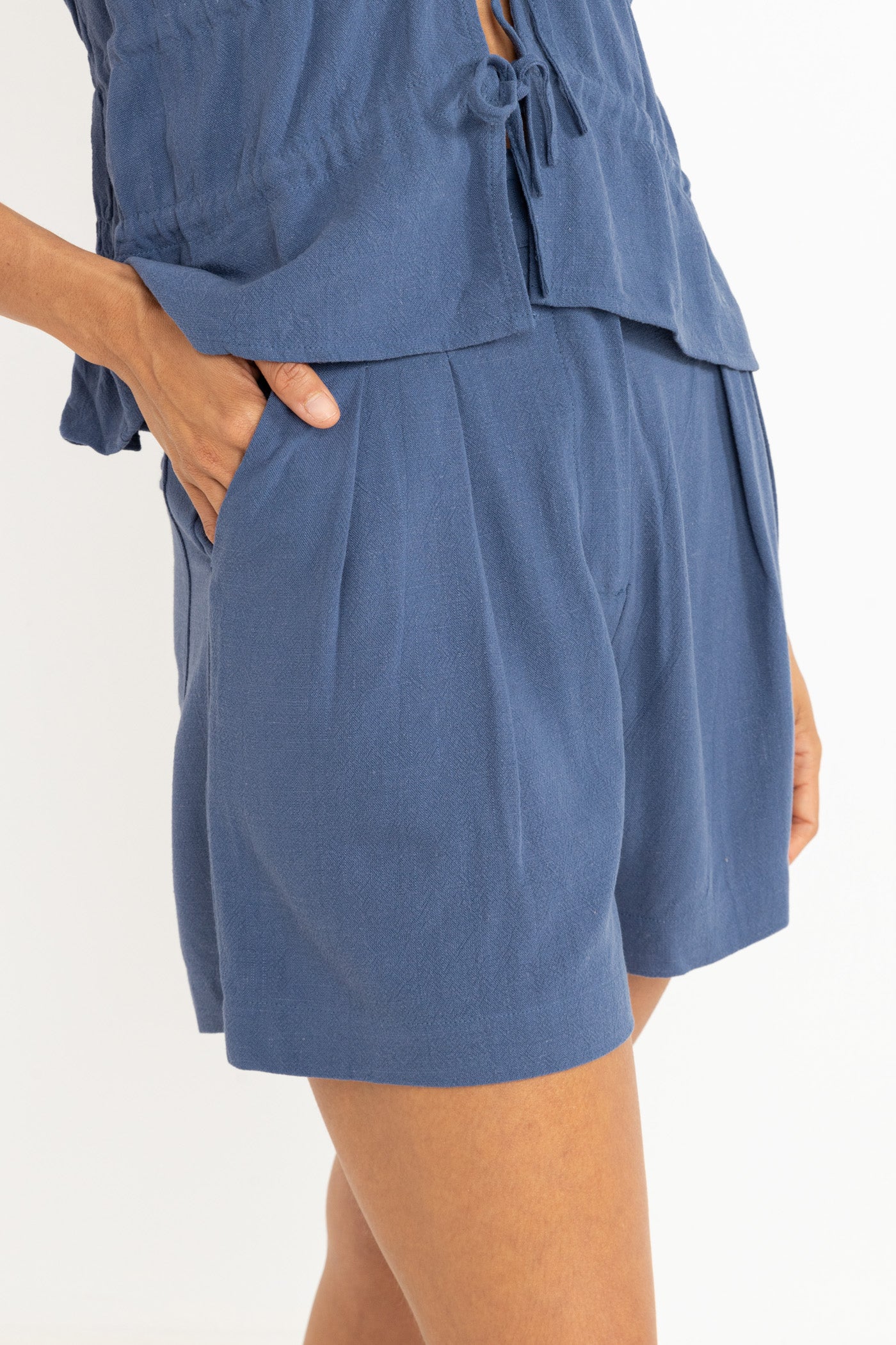Slip into the charm of the Ocean Short, crafted from soft linen for breathable comfort. With highwaisted pleats adding a touch of fun sophistication, and belt loops ready for your favorite cinch, these shorts bring style and ease together. Pockets keep your essentials close while you explore carefree days under the sun.